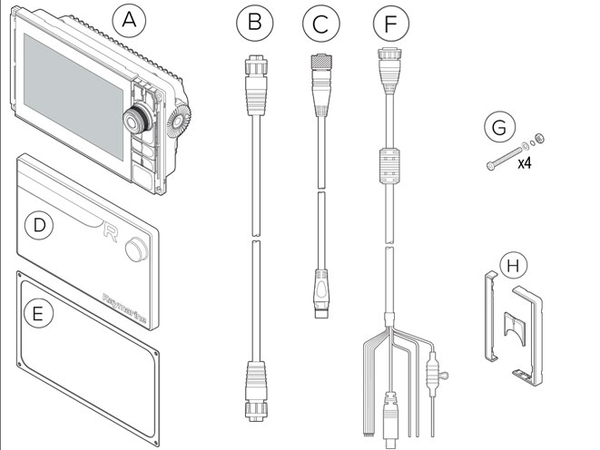 | Delivery | A: MFD display, B: RayNet on RayNet cable, 2 m, C: SeaTalkNG adapter to NMEA2000, D: sun cover, E: gasket for recessed mounting, F: voltage / video and NMEA0183 cables - straight male, G: mounting bolts ( 4 pcs.), H: side panels, Home and Start button, as well as a quick guide, a warranty card, Raymarine window stickers |