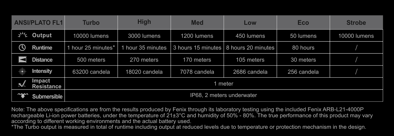 Следует подчеркнуть, что эти показатели свечения фонаря были получены в ходе лабораторных экспериментов. Где были созданы определённые условия. Использовались аккумуляторы ARB-L21-4000P литий-ионные, температура составляла 21 +- 3 градуса Цельсия, а влажность – порядка 50-80 процентов. Показатели работы изделия могут быть иными в случае использования других элементов питания и при иных условиях окружающей среды.